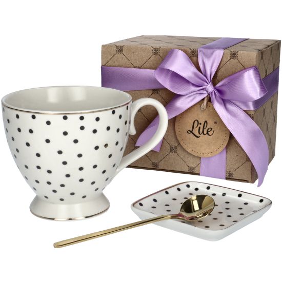 Filiżanka porcelanowa z podstawką i łyżeczką 350 ml Lile Bellis P28485 będzie uniwersalnym prezentem dla mamy, taty, brata, siostry, a nawet dziadków. Praktyczny i ponadczasowy produkt, będzie towarzyszył obdarowanej osobie na co dzień. O poranku pozwoli rozpocząć dzień ulubioną kawą, a wieczorem umożliwi delektowanie się rozgrzewającą herbatą podczas relaksującego wieczoru z książką czy serialem.