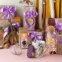 1. W pudełku znajdziesz fioletową wstążkę oraz bilecik, które ułatwią Ci stylowe zapakowanie prezentu. Odłóż je na bok i zachowaj, ponieważ przydadzą się podczas ostatniego kroku.